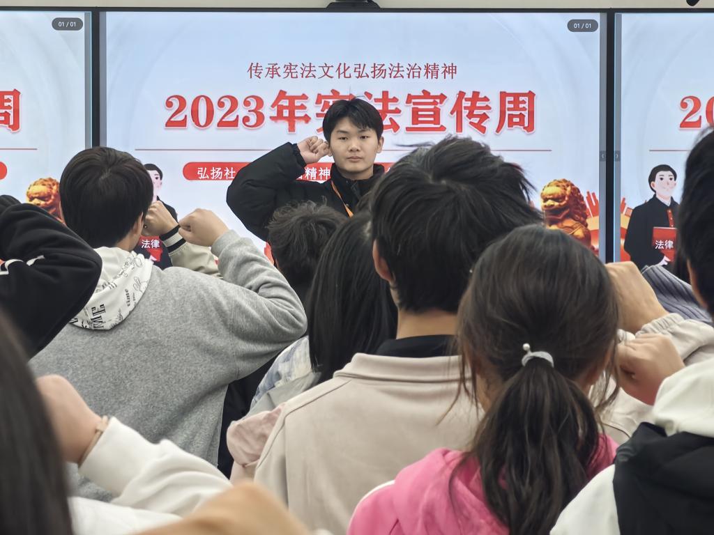 学院开展了一次宪法专题学习,通过中心组学习、支部主题党日、主题班会等形式深入学习宪法的内涵、精神和原则;参与了一次庄严宣誓,同学们接受了法治教育的洗礼,明确了自己在法治社会中的角色和责任,深化了对法律的认知和尊重,提高了遵纪守法的意识;实施了一次学习行动计划,各年级学生参与“宪法卫士”2023 年行动计划,通过网上自主学习、线下社会实践等方式,增强学生法治素养,引导学生争创“宪法卫士”,推动师生将宪法精神融入日常生活和学习中;传唱一首活动专题歌曲,莘莘学子们以歌言情、以歌明志、以歌颂心,在《宪法伴我们成长》宪法主题歌曲传唱中,同学们以饱满的感情和嘹亮的歌声表达对宪法的尊崇之情,展现了青年学子的蓬勃朝气和昂扬锐气。