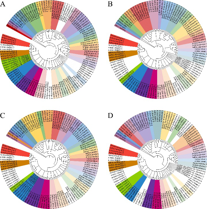 Fig 1 | The NJ tree based on four sequences. Successfully identified species are with bootstrap values above 60%. The dotted line indicates unsuccessful identified species. (A) The NJ tree based on ITS sequences, (B) The NJ tree based on ITS+psbA-trnH sequences, (C) The NJ tree based on ITS+matK sequences, (D) The NJ tree based on ITS+rbcL sequences.