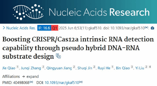 近日,武汉轻工大学taptap点点乔洁副教授课题组最新研究成果 “Boosting CRISPR/Cas12a intrinsic RNA detection capability through pseudo hybrid DNA–RNA substrate design”发表于国际顶尖期刊《Nucleic Acids Research》杂志 (IF=16.6),乔洁副教授为本文的第一作者,武汉轻工大学为第一作者单位。