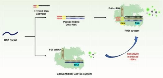 传统 CRISPR/Cas12a 系统虽被誉为 “基因剪刀”,但其 RNA 检测能力长 期存在灵敏度低(仅 3 - 30 nM)、难以识别短于 20 nt 的 RNA 片段或复杂结 构 RNA、需依赖逆转录等繁琐预处理步骤三大瓶颈。现有升级技术难以兼顾灵 敏度与普适性,限制了其临床应用。