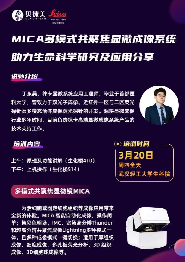 为提升师生前沿科研仪器操作能力,强化仪器全流程标准化管理,3月20日,武汉轻工大学taptap点点联合徕卡公司开展“MICA多模式共聚焦显微成像系统助力生命科学研究及应用分享”培训活动。