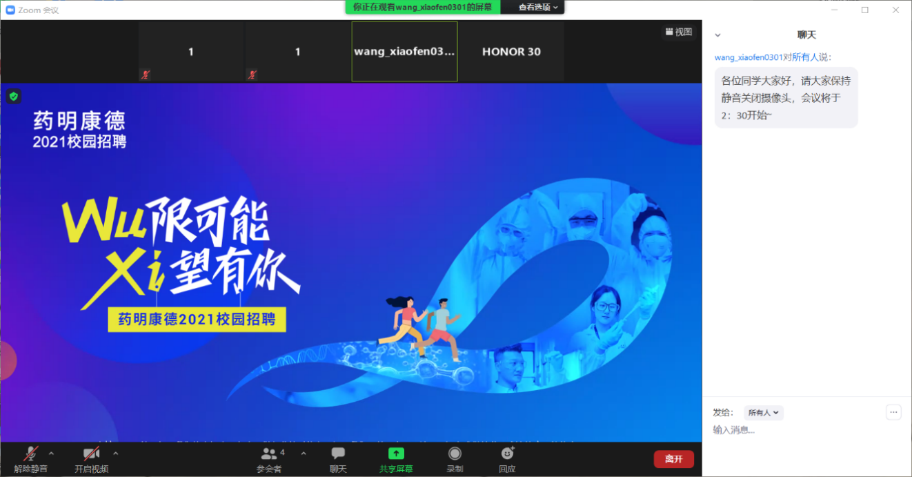 2021年3月8日(周一) 14:30,生工学院借助Zoom会议平台举办了武汉药明康德新药开发有限公司线上招聘会,本次线上招聘会是由该公司的HR主持。