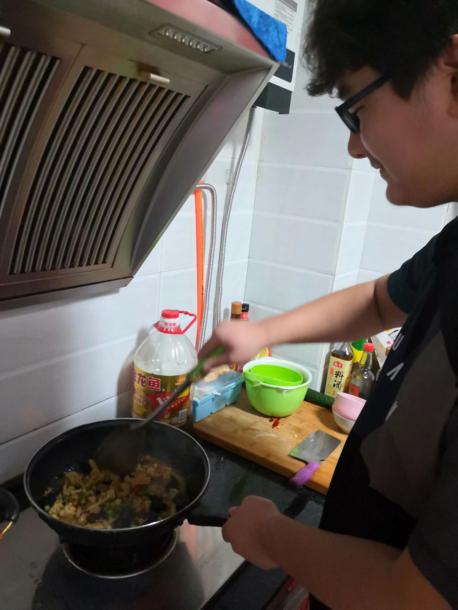 生工1903团支部成员正在为家人做一道拿手的菜肴。