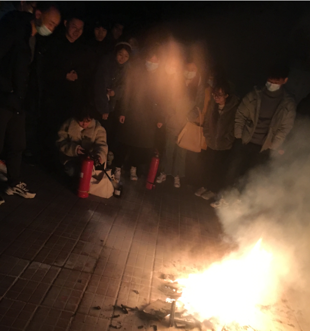 随后,现场模拟了火情发生的场景,根据风向确定最佳灭火位置,拿起干粉灭火器,上下颠倒几次后拔掉保险销,左手握住喷管,右手提着压把,在距离火焰两米处对准火焰根部进行灭火。大家操作规范,培训效果良好。
