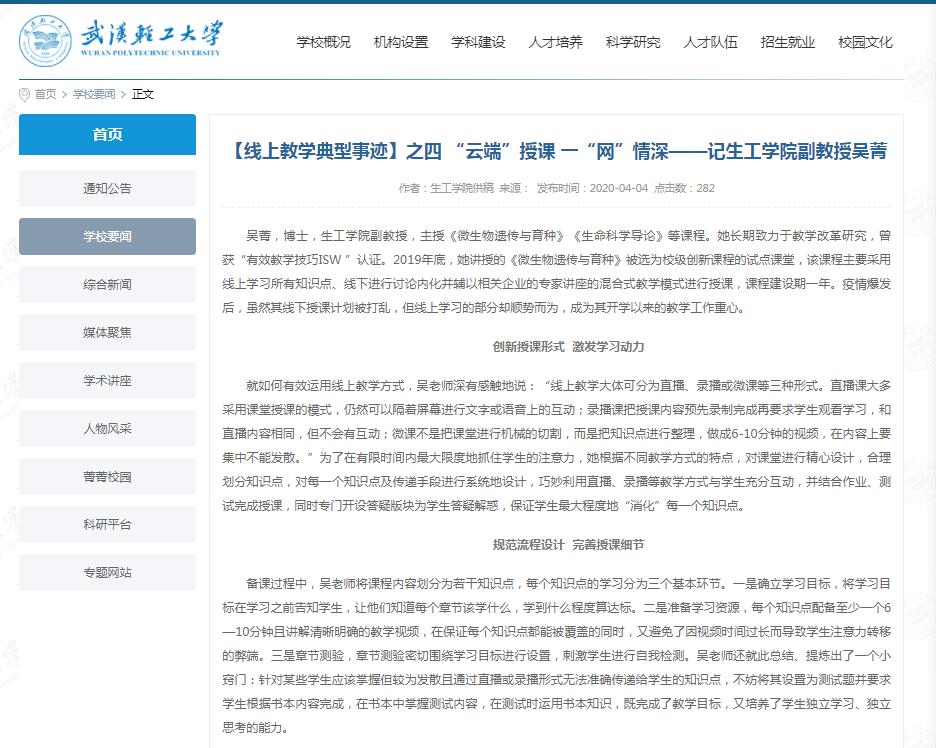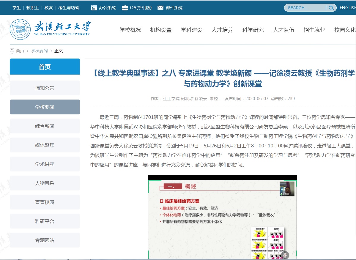 在2020年上半年的教学工作中,各创新课堂以邀请校外专家、学者来校讲座的方式,开展了15次创新课堂系列公开课,课程在学生、教师中引发广泛好评,其中徐凌云、吴菁老师的创新课堂讲座更是作为轻工大学线上教学典型事迹受到学校首页要闻报道(【线上教学典型事迹】之八 专家进课堂 教学焕新颜 ——记徐凌云教授《生物药剂学与药物动力学》创新课堂,报道链接:https://www.whpu.edu.cn/info/1003/15521.htm;【线上教学典型事迹】之四 “云端”授课 一“网”情深——记生工学院副教授吴菁,报道链接:https://www.whpu.edu.cn/info/1003/15105.htm)。