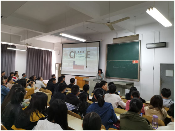 首先,Florencia教授做了简单的自我介绍。接着介绍了智利的地理位置,在地图上可以看出,他们国家的地形呈又长又窄的形状,特色鲜明;然后从南到北讲述了他们国家的各个地区的城市、风景、美食以及当地人爱好习俗等。随后,Florencia教授从听、说、读等方面给同学们教授了西班牙日常用语,同学们对此非常感兴趣,也非常积极好学。最后,Florencia教授让学生自由提问,同学们向她询问了关于她的家庭情况、智利的一些相关问题,她一一详细回答,现场气氛十分活跃,同学们对Florencia教授十分热情,纷纷找她合影留念。通过Florencia教授和同学们之间的互动,使彼此之间迅速建立友谊,相处十分欢乐融洽。