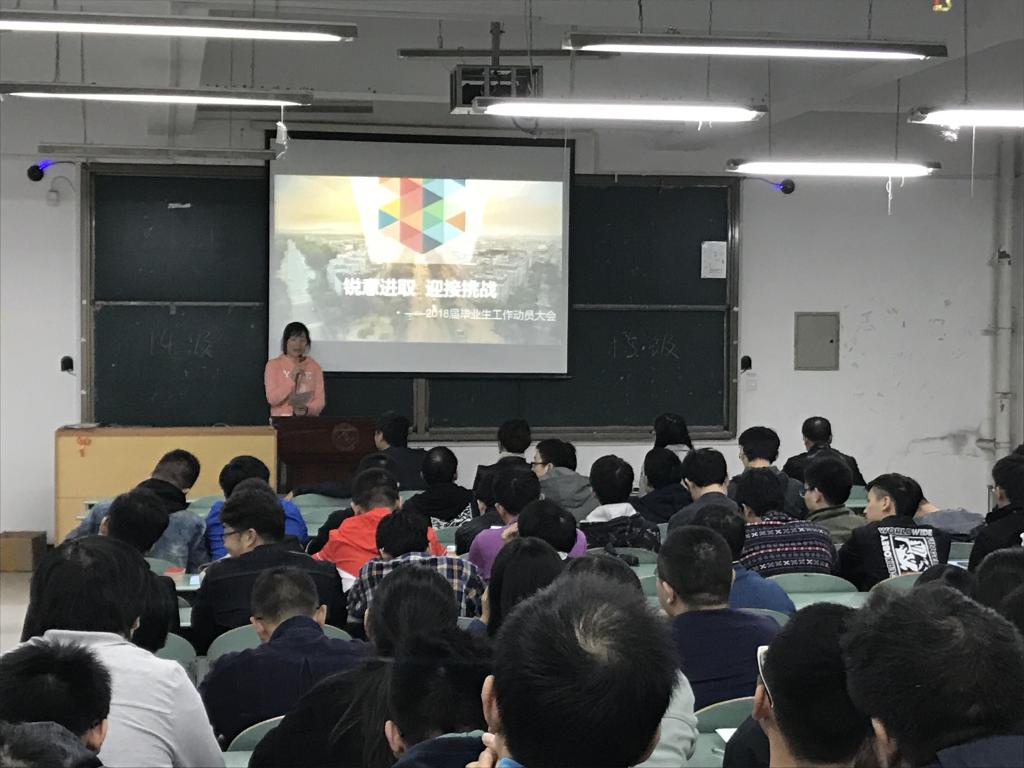 中外班辅导员邹威老师作了以“锐意进取,迎接挑战”为主题的动员讲座,极大地调动了毕业生的就业积极性。