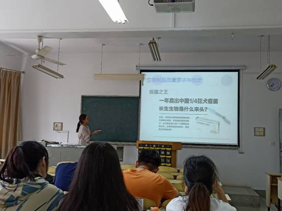 李艳老师本堂课的主题为生物制品中疫苗的生产安全质量管理,课堂首先以长春长生生物科技有限公司的百白破疫苗及狂犬病疫苗事件案例作为导入,结合学生自身经验,引导学生思考疫苗等生物制品的质量要求,引出疫苗的安全性、有效性及可接受性的质量标准等内容。课堂上,同学们理解了生物制品在生产过程中一定要按照GMP进行,不能贪图利益,而置国家人民的生命安全于不顾,在未来的职业生涯中,也要牢牢守住职业道德底线,做一个有家国情怀的人。