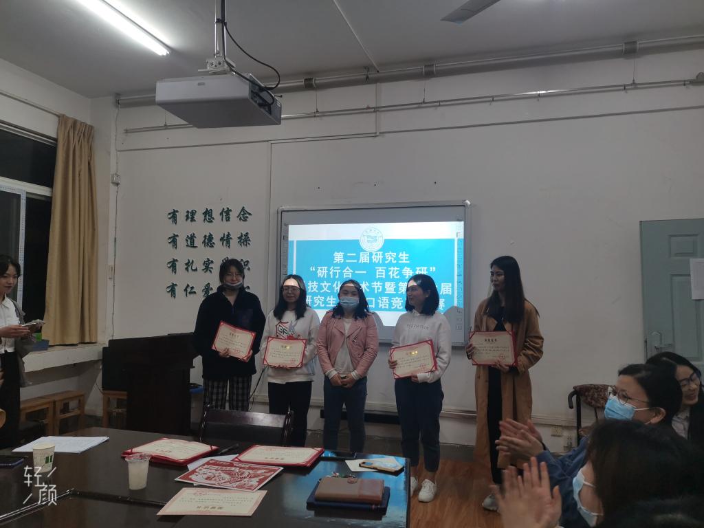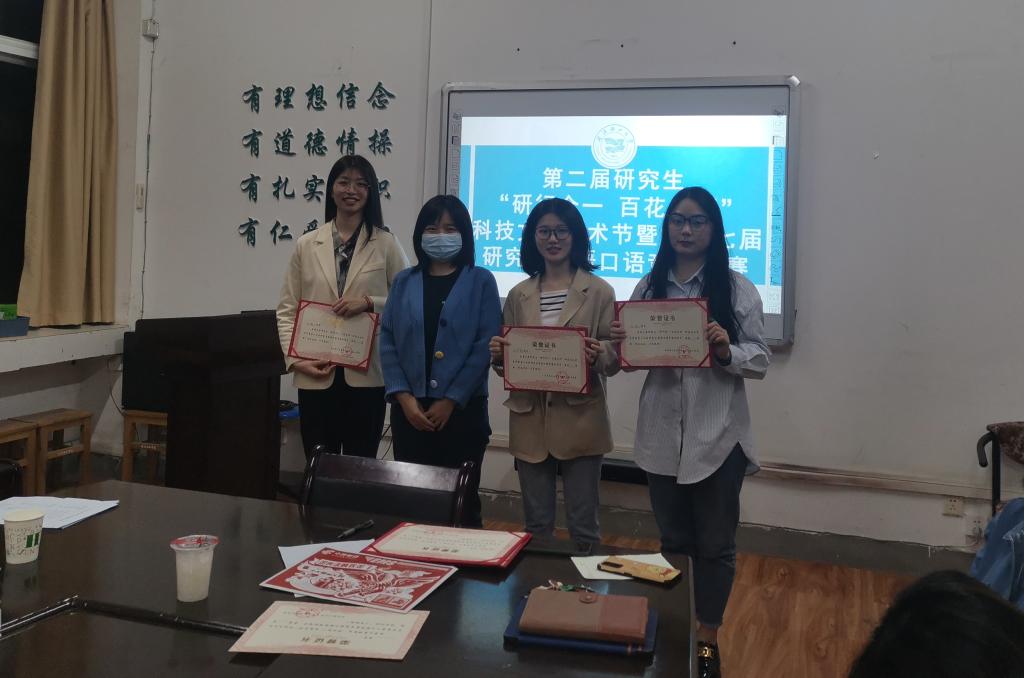 最后王丽梅、余洁、姚圣黎三位老师依次上台给同学们颁发证书并合影留念。王老师做活动点评,她指出,同学们今天的表现都很棒,英语用途广泛,希望大家以后养成自主学习英语的习惯,不断练习,提高自己的英语口语水平和外文文献阅读水平。本次活动极大激发了同学们练习口语的积极性,增强了大家敢于开口说英语的自信心,大家纷纷表示以后要加倍努力学好英语。