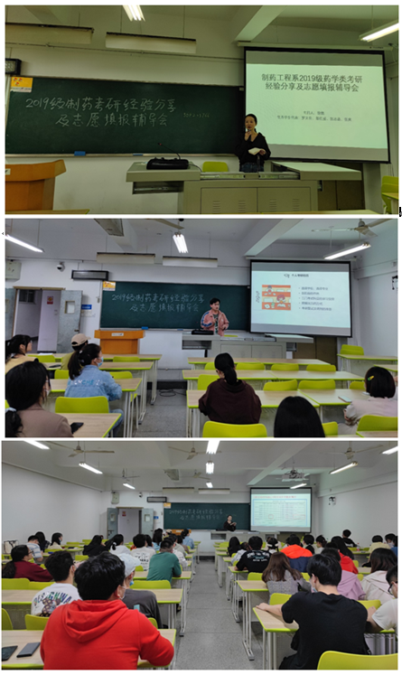 分享结束后,系主任徐燃老师介绍了制药系往年升学率,着重对18级药学类每个班级的考研数据进行了对比,分析考生成功和失利的原因,强调要多和老师沟通,结合学校招生需求选择报考院校,不要盲目追求名校。徐燃老师还介绍了今年本院研究生的招生录取情况,介绍推荐了校外合作硕导,鼓励同学们报考本校。