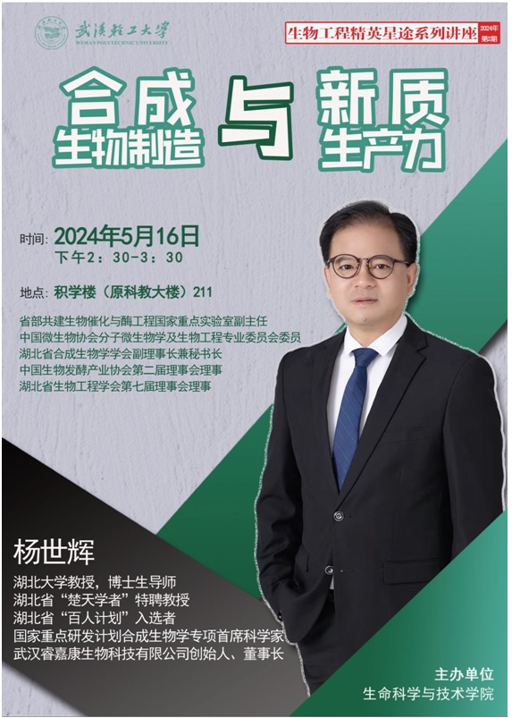 2024年5月16日下午,国家合成生物学重点研发计划首席科学家、湖北大学教授杨世辉应邀来我校为taptap点点主办的“生物工程精英星途”系列讲座作专题报告。