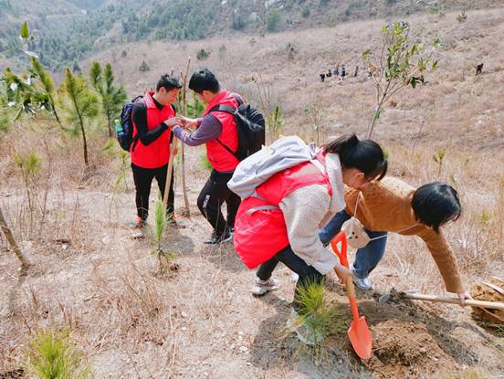 志愿者在领到了树苗之后,立刻开始行动,按照之前划分的小组开始种树。种树的时候,他们认真的挥着铲子,将坚硬的泥土块翻开,里面还有着很多的大石头,志愿者们小心翼翼的将其撬开,然后将树苗放进土中埋好,看似十分简单的行为,志愿者们却硬生生的进行了半个小时左右。山脚下,荒草丛生,遍地都长满了有倒钩倒刺的植物,有几位志愿者的衣服被刮破了,有的甚至身上有了伤痕,但他们毫无怨言,依旧认真完成了任务。