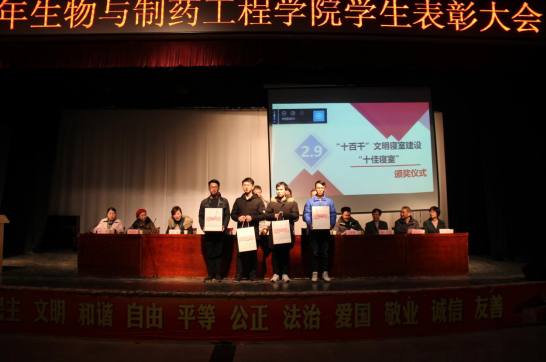 奏唱国歌后,各位领导开始宣读武汉轻工大学生物与制药工程学院系列荣誉表彰文件,由领导和嘉宾为获得表彰的同学进行颁奖,并寄语受奖励的同学戒骄戒躁,珍惜荣誉,开拓创新,充分发挥模范带头作用。