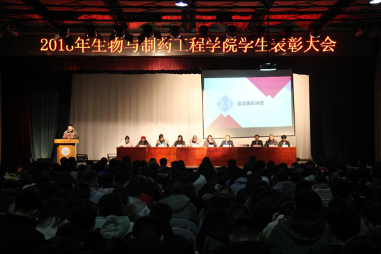 (通讯员 叶青)为了表彰先进,树立典型,营造优良的学风,2018年12月14日晚上18:30生物与制药工程学院学生表彰大会在常青校区大学生活动中心隆重召开。参加本次大会的有生工学院领导班子全体成员、教学系系主任、班主任、辅导员和生工学院全体学生。江苏远大仙乐有限公司董事长张邦国、武汉鑫星星科学仪器有限公司总经理王雪芹等企业领导也受邀参加了本次表彰大会。本次大会由生工学院分团委书记叶青主持。
