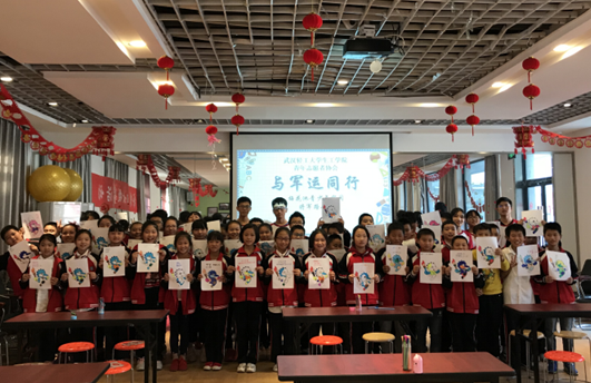 挂牌仪式过后,轻工大生工学院青年志愿者协会的志愿者们为将军路小学的孩子们带来一节“与军运同行”军运知识科普课程。课上,志愿者老师为大家科普军运知识、观看军运宣传小视频,带领大家唱《红旗飘飘》,最后辅导小朋友为军运吉祥物“兵兵”涂色。