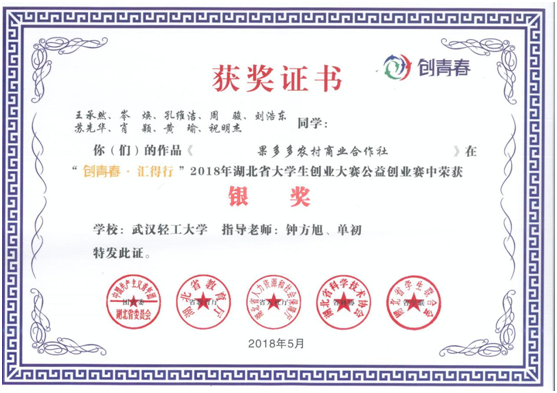 5月27日,2018年“创青春·汇得行”湖北省大学生创业大赛颁奖典礼在武汉理工大学举行。本届大赛是由团省委、省教育厅、省人社厅、省科协、省学联联合主办,包含创业计划竞赛、创业实践挑战赛、公益创业赛等3个类别,共有来自全省70所高校的675件作品参赛。经过书面评审和终审答辩环节,由武汉轻工大学生工学院申报的作品《果多多农村商业合作社》荣获公益创业赛银奖。