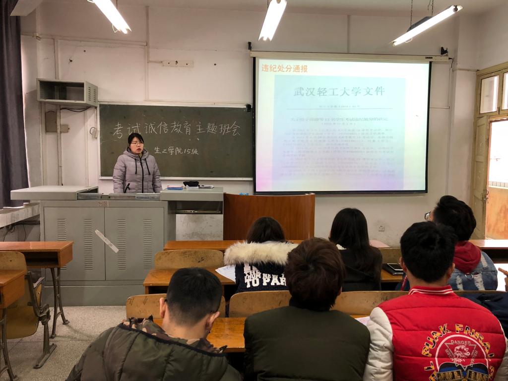 为迎接即将到来的四六级考试以及期末考试周,创建良好的学风、考风。生工学院于2017年12月13号在医护楼举行了15级普班学生考试诚信教育会,15级普班各班班长以及团支书参加了本次教育会,会议由生工学院辅导员叶青老师主持。