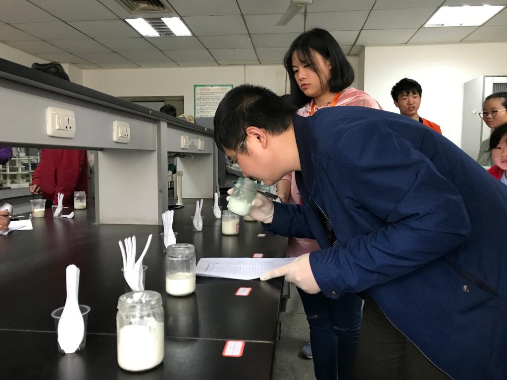本次初赛,每个组的同学都积极准备初赛作品,每当有空余的时间参赛选手们都会赶到实验室进行酸奶制作。11月3日下午15:30初赛进行了最后的评分环节。四个评委分别品尝二十个小组的酸奶,并对每个组制作出的酸奶的色泽、气味、外观和味道进行了专业的评价和打分。在评委品尝过程中,每个同学都十分紧张,大多数同学都是第一次自己亲手制作酸奶,每当评委对品尝的酸奶表示认可时,酸奶的制作者都会欣喜不已,当然对于评委们的建议和指导,他们也都虚心受教。在评分环节结束之后,所有的同学都留下来将自己的实验器材清洗干净并将多余的酸奶带回去与没能来参加比赛的同学分享。选手们的参赛态度和责任感让初赛的结果没有那么重要了。