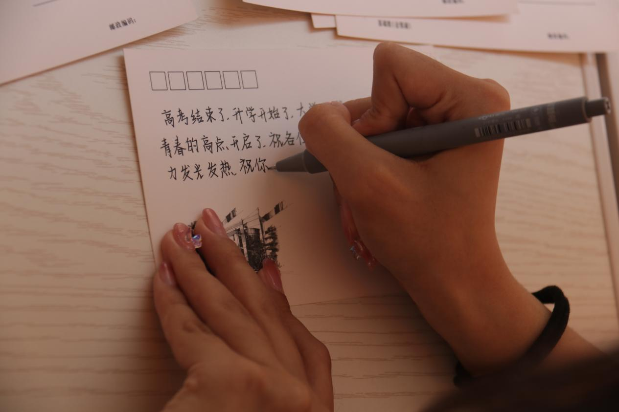 新生来校之前,学院就为全体新生志愿者订制了轻工大学专属文创明信片,志愿者们精心为每一位学弟学妹手写了开学寄语。明信片正面是学长学姐对新生未来生活的美好祝愿、专业学习的恳切建议,以及好好珍惜大学时光的谆谆嘱托,背面则是轻工大学优美的标志性建筑物。一封封小巧精致的明信片,凝聚着学长学姐的爱护和关怀,让新生在熟悉校园环境的同时,提升爱校荣校观念,鼓励新生们用实际行动诠释爱校之心、荣校之情,共做青春赛道的追梦人。