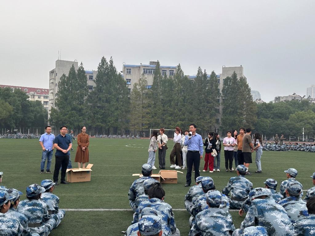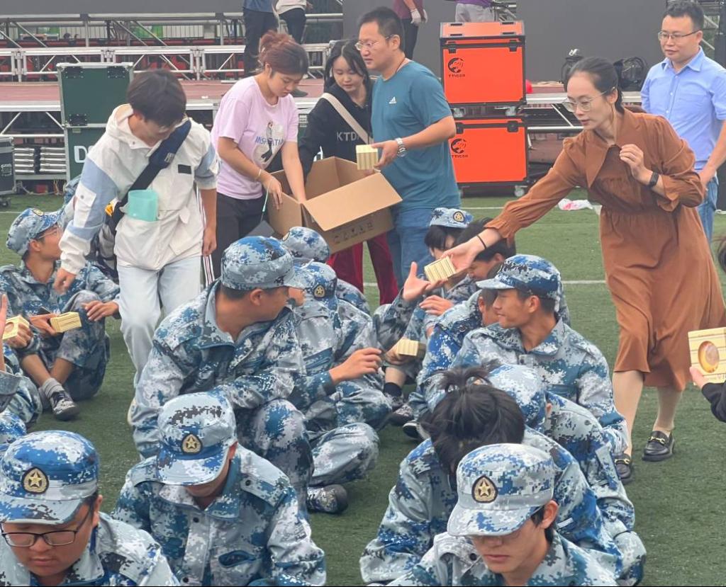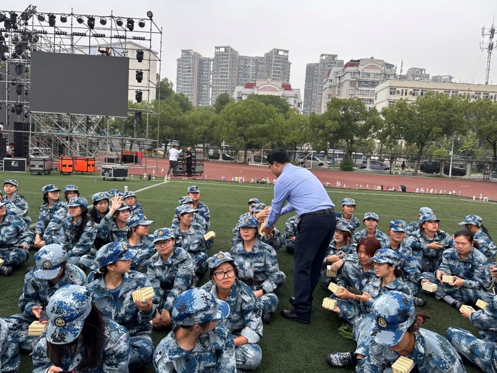 在中秋、国庆佳节到来之际,taptap点点党委书记易文君、副书记罗霄携新生辅导员、班主任及导学员来到军训场地,开展节前慰问活动,为在军训场上挥洒汗水的taptap点点2023级本科新生送去节日慰问品。
