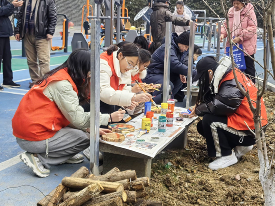 随后志愿者与居民共同参与到了绿色驿站升级改造活动中,用切片木块、画笔、颜料进行创作、装点。经过共同努力,玫瑰园的整体绿化焕然一新、生机盎然。这个“绿色驿站”被五颜六色的绿植装点得如诗如画,放眼望去的活力生机让人心旷神怡。改造升级后的“绿色驿站”已成为居民们健身休闲的好去处,也是居民们共同缔造美好家园的见证。
