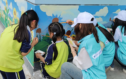 在活动的实践环节,志愿者们与小朋友们一同进行了墙绘,欢声笑语中为小区里增添了一处亮丽的风景线。此外,在社区工作人员的指导下,我们的志愿者们还协助小朋友们使用铲子挖洞种小树苗、播种波斯菊,让孩子们亲身体验到绿化环境的乐趣和意义。