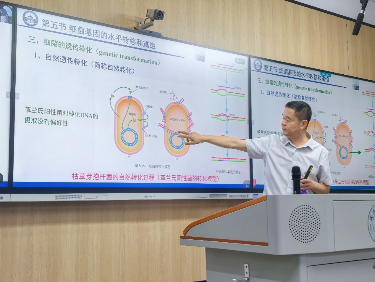 讲座中,陈向东教授以其深厚的学术积淀和风趣的语言风格,迅速抓住了同学们的注意力。他围绕细菌自然遗传转化的核心概念和重要途径进行了深入讲解并特别指出,传统自然遗传转化研究多以受体为主,然而许多细菌可通过DNA胞外分泌及细胞间接触影响转化过程。在6项国家自然科学基金的连续资助下,陈向东教授团队通过对枯草芽孢杆菌的持续研究取得了重要突破。他们发现,枯草芽孢杆菌之间的自然遗传转化可以通过增加DNA片段的转移以及促进连续DNA区域的交换来推动水平基因转移,DNA供体细胞可能发挥着此前未被充分重视的重要作用。这一发现不仅挑战了传统认知,也揭示了实验室条件下对传统细菌自然转化潜力的认知可能被大大低估。因此,亟待从DNA供体细胞的角度深入揭示细菌遗传转化的机理及其生物学意义。